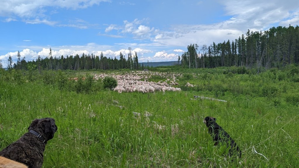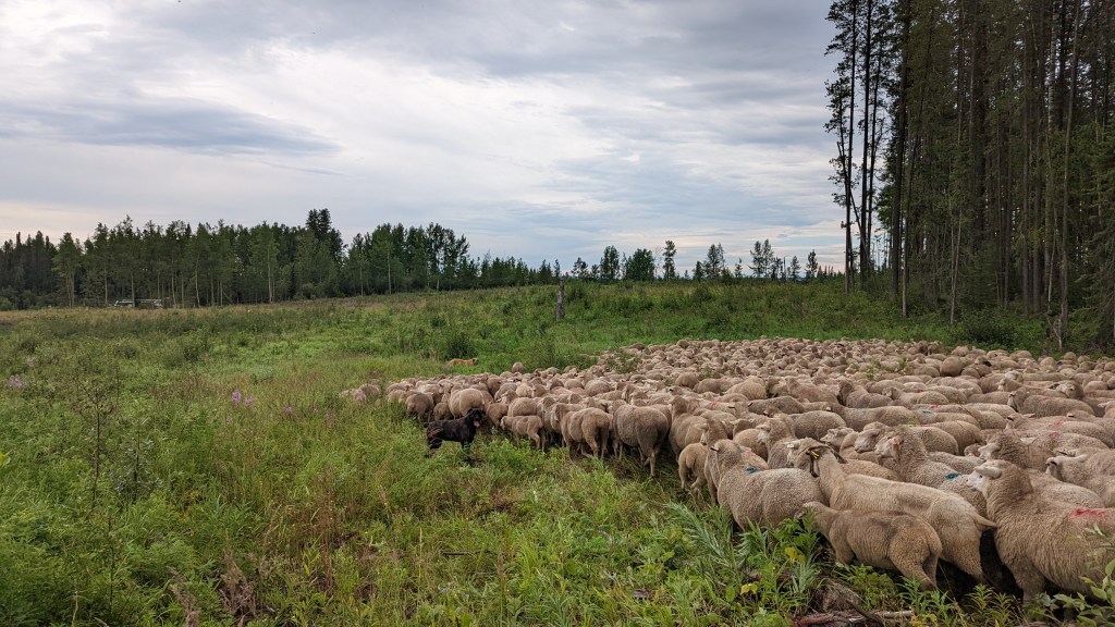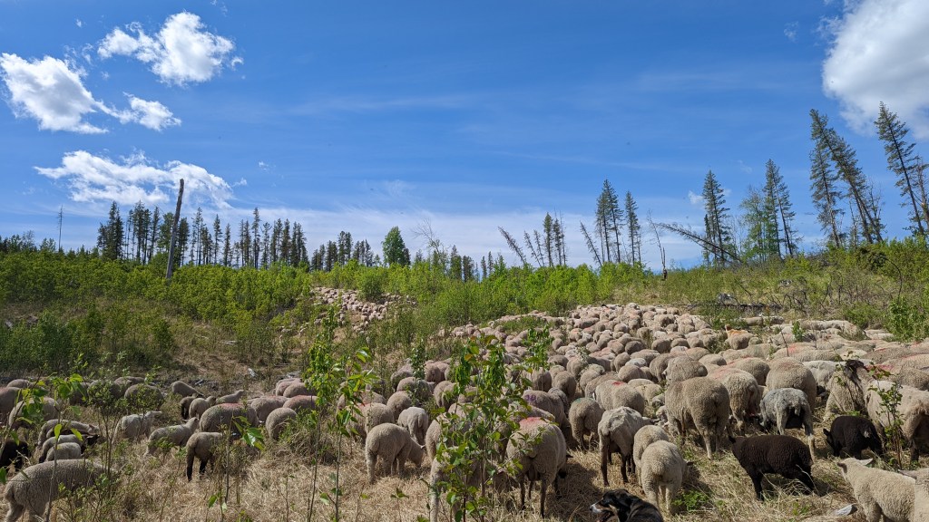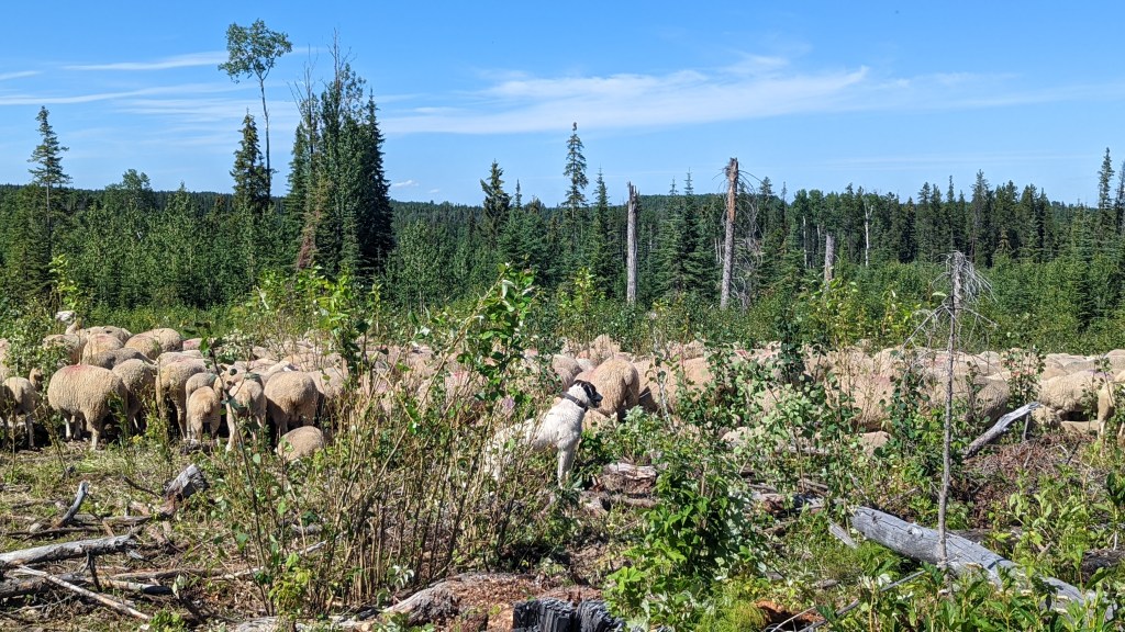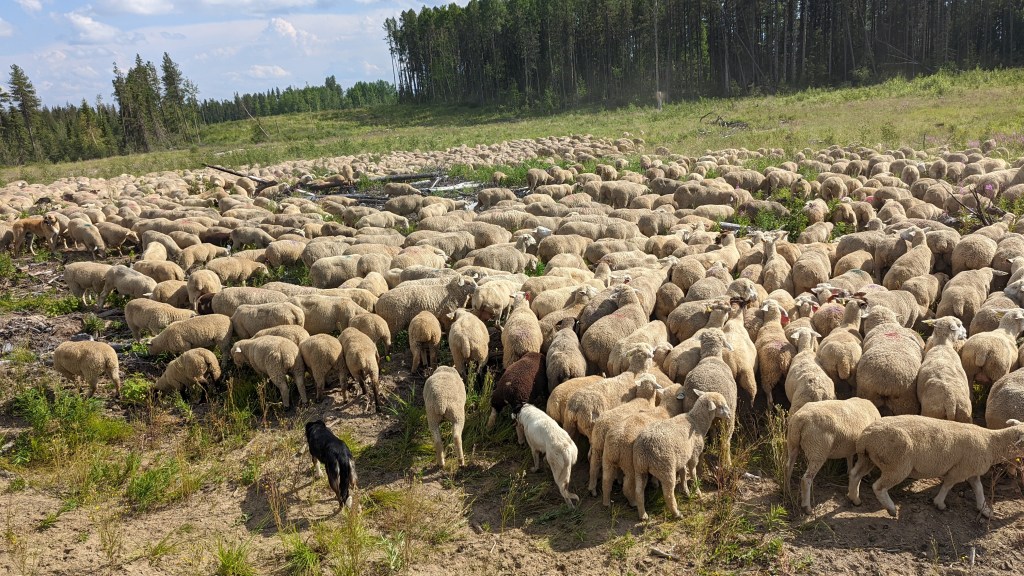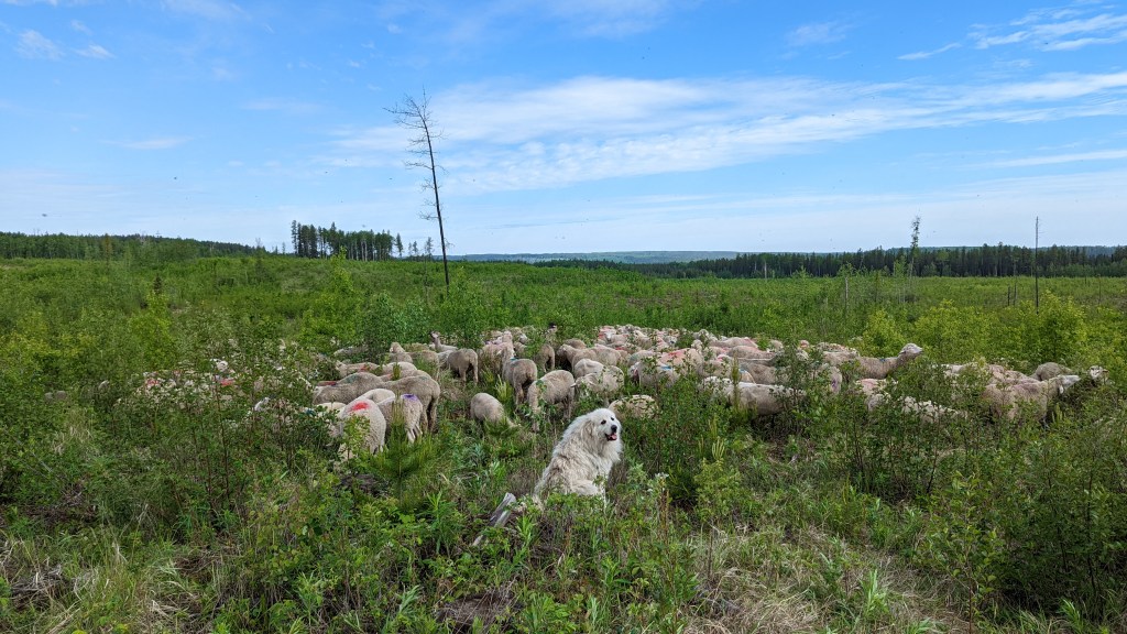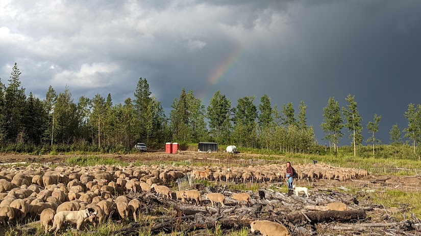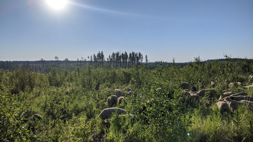 The images on this page were all taken in the summers of 2021 and 2022, at various logging locations around Drayton Valley, Alberta. The ~1200 sheep were circuit grazed on the cutblocks, to manage primary succession species of grass, bushes, and other plants that would outcompete planted forestry saplings for sunlight and space.